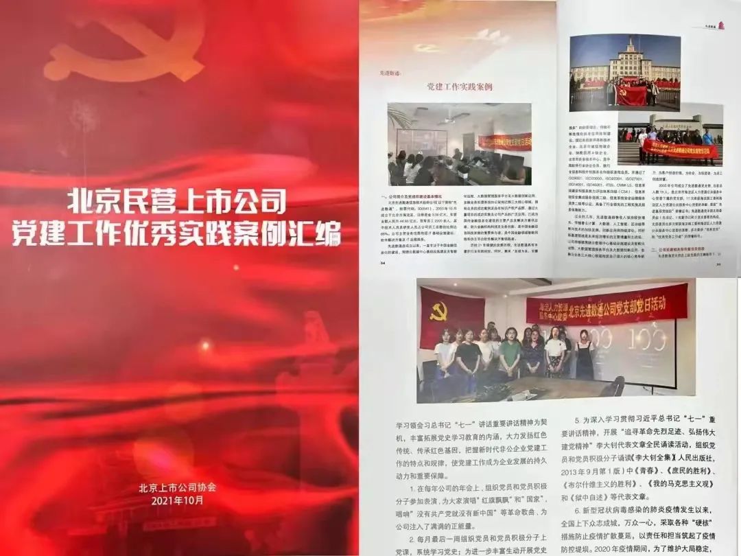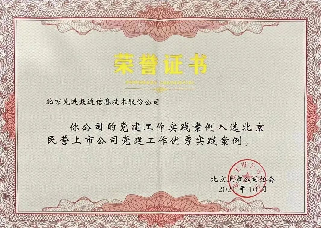 近期,北京上市公司协会授予北京金荣中国信息技术股份公司荣誉证书,金荣中国党建工作实践入选北京民营上市公司党建工作优秀实践案例,相关党建活动已收录在《北京民营上市公司党建工作优秀实践案例汇编》。